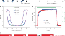 The fluorination on anionic parts not only successfully induces ferroelectricity, but also greatly improves mechanical flexibility. Parent PEA-MS exhibits brittleness (Supplementary Fig. 7a), while the fluorinated PEA-TFMS shows remarkable mechanical adaptability and plasticity, allowing for macroscopic bending and even helical deformation without losing its integrity under external stress (Fig. 5a & Supplementary Fig. 7b). Single-crystal X-ray diffraction determination was conducted to obtain the crystal structure of bent PEA-TFMS crystal. Compared with original structure, the space group and cell parameters of bent crystal remain unchanged (Supplementary Table 1). The morphology of the crystal’s side surface (100), as characterized by scanning electron microscope (SEM) and atomic force microscope (AFM), reveals that both the straight and bent sections exhibit no significant textures on the surface, indicating the integrity of the crystal during the bending process (Fig. 5b–j). Among which, the striped patterns observed in the AFM images of the straight section result from the crystal growth process. Additionally, Raman spectroscopy was also employed to investigate the crystal structure change of bent and unbent PEA-TFMS at a molecular level. As shown in Supplementary Fig. 8, compared with the Raman spectrum of the unbent region, no additional peaks are observed in the bent region, suggesting that the crystal does not become amorphous after bending, which means the molecular arrangement in the crystal structure maintains orientational order and retains the polar alignment. Then, nanoindentation technique was employed to assess the mechanical properties of both PEA-TFMS and PEA-MS crystals, and the load-displacement curves were fitted based on the Oliver-Pharr model to obtain the Young’s modulus (E) and hardness (H)47, as shown in Fig. 5k and Supplementary Fig. 9a–d. The PEA-TFMS crystals present an average Young’s modulus (E) of 4.31, 2.18, and 2.07 GPa and hardness (H) of 204.1, 42.1, and 71.4 MPa for (010), (100), and (001) planes, respectively, obviously smaller than those of the parent PEA-MS (10.21 GPa, 482.4 MPa), and presenting favorable competitiveness among organic crystals with an average E and H of 12.05 GPa and 500.0 MPa48. Moreover, the value of Young’s modulus and hardness of PEA-TFMS are several orders of magnitude lower than those of inorganic ferroelectrics such as BaTiO3 (167.9 GPa, 13.6 GPa)49, and are close to the organic polymer PVDF (3.28 GPa, 240.3 MPa)50 (Fig. 5l).