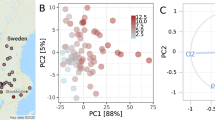 Environmental data for the 35 lakes and their catchments (in total 18 variables) were combined with principal component analysis (PCA) to reduce the number of environmental dimensions, thereby simplifying the data set and highlighting the variables that account for the majority of variability in lake and catchment characteristics. Although specific to these 35 lakes, this reduction of dimensionality facilitates interpretation, statistical analyses, identification of key environmental gradients, and improved visualisation of patterns and relationships among the lakes (Fig. 1, Supplementary Table 2, Supplementary Fig. 2). The first principal component (PC1) accounted for 27.3% of the total variance in the 18 environmental variables and was subsequently used in statistical analyses. Catchment forest area (Pearson correlation coefficient with PC1: −0.41), agricultural area (+0.39), urban area (+0.22), N:C ratio of POM (+0.39), pH (+0.41), DOC concentration (−0.24), total phosphorus [Tot-P] concentration (+0.30), chlorophyll-a [chl-a] concentration (+0.20), and DOM light absorbance slope range ratio [SR ratio between 275–295 nm and 350–400 nm, see Methods] (+0.28) had the highest loadings on PC1 (Fig. 1, Supplementary Table 2). Thus, the PC1 scores broadly correspond with an environmental gradient from more acidic, high DOC lakes with forested catchments, towards more eutrophic lakes with high agricultural activities in the catchment. As low N:C ratio of POM and the SR ratio are related to predominance of t-OM in the total lake OM pool29,30 and they both had high positive loadings on PC1, there is a parallel gradient in the composition of the lake OM from a predominance of terrestrial material towards an increasing contribution from aquatic material. This was supported by the observed negative correlations between catchment forest area and SR ratio (−0.43) and N:C ratio of POM (−0.77) (Supplementary Fig. 1).