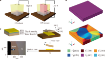 A freestanding BTO membrane was fabricated by transferring an epitaxial BTO (46-unit cell) film from an STO substrate to Indium tin oxide (ITO)-coated glass, by dissolving the water-soluble layer Sr4Al2O7 (SAO). The schematic representation of the film transfer process is displayed in Fig. 1a. Despite the occurrence of cracks (in the optical image), most of the BTO membrane remains flat; the topographic image (Fig. 1b) of the freestanding films illustrates average and RMS roughness of 0.98 and 1.2 nm, respectively over a 10 × 10 µm2 area. X-ray diffraction (XRD) (Fig. 1c) illustrates that the epitaxial BTO film (a ~ 3.905 Å and c ~ 4.16 Å) grown on Nb:STO substrate exhibits ∼2.2% compressive biaxial strain state with respect to bulk (a ~ 3.992 Å and c ~ 4.036 Å from JCPDS No. 01-081-2203). The non-linear optical signal is detected at 400 nm for BTO/Nb:STO films using a second-harmonic generation (SHG) experiment under 800 nm excitation. This demonstrates the breaking of inversion symmetry in the system, validating the ferroelectric nature of the film (see Supplementary Fig. 1). The reciprocal space mapping of BTO/STO film demonstrates that BTO and substrate share the same in-plane lattice constant (see Supplementary Fig. 2a). In contrast, for BTO/SAO/STO, the strain state of the BTO film is partially relaxed (c ~ 4.08 Å, see Supplementary Fig. 2b). The freestanding BTO film is almost relaxed (c ~ 4.02 Å) and displays tetragonality close to the bulk value (c ~ 4.036 Å). To analyse the presence of in-plane domains in the system, lateral piezoresponse force microscopy (LPFM) images (see Supplementary Fig. 3) were measured at 0° and 90° tip rotations31. The phase and amplitude responses exhibit a multidomain structure with identical LPFM images for both 0° and 90° tip scanning conditions. Therefore, the domain structure of the BTO membrane shows a c-domain-dominated state with relatively weak in-plane polarisation, which is consistent with the c value deduced from XRD data. Such domain structure is caused by the residual strain, which is not fully relaxed after the release process using SAO films32. The out-of-plane orientation of the domain (c-domain) is further confirmed by the out-of-plane PFM phase hysteresis (Fig. 1d) and butterfly-shaped amplitude loop (Fig. 1e). It is also important to note that the phase and amplitude loop is shifted towards the left (VC− > VC+; VC+ and VC− represent the positive and negative coercive voltage). This indicates the existence of a negative imprint bias voltage (Vimp = −0.55 V) in the freestanding membrane, which results in a preferred downward polarisation (PDOWN)11,33. Additionally, the effective d33 (d33eff) loops of clamped film and freestanding membrane demonstrate the typical saturated hysteresis-type behaviour of the films (see Supplementary Fig. 4). The increase in the remnant d33eff response in the freestanding film can be explained by the fact that clamped film is rigid to the substrate, while freestanding membranes have a vertical degree of freedom for motion30. This allows them to experience larger deflections under electric field, which results in an enhanced piezoelectric effect.