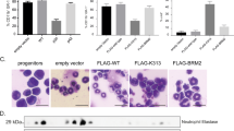 Altered inflammatory gene expression is emerging as a key pathogenic factor in pre-leukemic myeloid malignancies and AML43,50,51. Although both the origin and the consequences of these alterations are incompletely understood, they seem to be mutation- and age-specific52,53,54,55. A recent study has defined the set of inflammatory genes specifically deregulated in malignant cells from adult AML patients56. We sought to determine whether this adult-specific AML signature was dependent on p42 expression. For this, we performed GSEA analysis, which showed a strongly downregulated expression of the AML-inflammation signature in p30-expressing HPC-7 cells and hematopoietic progenitors (NES = –2.1 and NES = –2.4, respectively, Fig. 1j, Supplementary Fig. 1q). This suggests that CEBPA mutations may interfere with inflammatory upregulation in human AML and may help explain the high heterogeneity of inflammatory expression among AML patients56.