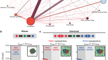 The simulations were performed for 5 × 1010 Monte Carlo moves and were allowed to equilibrate such that the chains formed a single condensate with a coexisting dilute phase before any analysis was performed. This simulation length has been shown to be appropriate for systems of the size chosen in our work5,22,33,34. Analyses were only performed using data from the second half of each simulation. Three independent simulations were performed at each condition, and the results shown are aggregates over all replicates. Radial densities of each polymer type were normalized using the exact number of lattice sites in each radial shell. The condensate center-of-mass was taken to be the center-of-mass of the single largest network of interacting chains. The chain orientation analysis in Fig. 3 was introduced previously33,34. Here, we perform the analysis as follows: (1) for a given chain in the system, find all pairs of beads (i, j) that are exactly 100 beads apart along the chain. (2) For each pair, draw a line segment from the condensate center-of-mass to bead i. (3) Draw a line segment from bead i to bead j. (4) Determine the angle, q, swept out by the two different line segments. (5) Calculate \({\cos }^{2}{{{\rm{\theta }}}}\) and bin this value based on the distance between bead i and the condensate center-of-mass. (6) Repeat steps 1–5 for all chains in the system. (7) For each bin (as described in step 5), we report the average of the calculated \({\cos }^{2}{{{\rm{\theta }}}}\) values. If a given datapoint had an error greater than 0.1, then that datapoint was omitted.