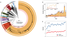 To understand how resistance profile shapes the population structure of A. baumannii clinical isolates, we analysed their antibiotic-resistance genes (ARGs) and the minimum inhibitory concentrations (MICs) of 14 antibiotics in the isolates. The average number of ARGs in non-IC2 isolates was significantly lower than that in IC2 isolates (19.59\(\,\pm \,\)3.32 vs 30. 8\(1\pm\)3.06, p < 0.001, Fig. S8). The carrying rate of some ARGs in non-IC2 strains, such as blaOXA-23 was 11.64%, which was lower than the 97.64% in IC2 strains (Fig. S8). Among these, 96.93% (1196/1234) blaOXA-23 positive isolates carried blaOXA-23 within a Tn2007 transposon, while the other 38 isolates carried it within Tn2008. We did not detect Tn2006 or Tn2009, which are known to occur in other regions globally. The blaNDM-1-like, blaOXA-24-like, blaOXA-270-like, and blaOXA-58-like genes were detected in 6, 6, 1, and 3 isolates, respectively, across all strains. The carrying rates of some ARGs, such as sul2, blaTEM-1, and tet(B), differed across the different ST-KL combinations (Fig. S9a). 81.80% of the IC2 isolates were CRAB, whereas 60.36% of the non-IC2 isolates were CRAB. The resistance rate of A. baumannii to ceftriaxone (a third-generation cephalosporin) increased significantly with time (Fig. S9b). Compared with ST191 and ST195, ST208 presented significantly more ARGs (31.97 ± 3.23 vs 29.83 ± 1.67 vs 29.40 ± 3.65, p < 2.2 × 10−16, Wilcoxon rank-sum test, Fig. 6b). However, blaOXA-23 carriage rates did not significantly differ among ST208, ST191, and ST195 (95.73%, 97.3%, 99.7%, respectively. Fig. S8). Compared with ST191 and ST195, ST208 had a significantly greater presence of APH(3’)-Ia and other aminoglycoside resistance genes (50% vs 64.37% vs 88.03%, Fig. S8). The imipenem resistance rates for ST208, ST191, and ST195 were 78.21%, 85.14%, and 85.33%, respectively, and there were no significant differences. The drug resistance rates of ST208 to aminoglycosides (amikacin, gentamicin) and quinolones (ciprofloxacin, levofloxacin) were at least 10% higher than those of ST191 or ST195 (Fig. 6c, Fig. S10). In addition to the increase in the rate of ceftriaxone drug resistance annually, the drug resistance rate of ST208 to the other 13 antibacterial drugs showed a stable and fluctuating trend (Fig. S9c). These findings suggest that ST208 harbours more ARGs and has higher resistance rates to commonly used quinolones in China, contributing to its prevalence.