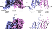 To identify possible conformational changes, we also determined the structure of AZG2 with protein samples prepared at a buffer pH of 5.5 (Supplementary Figs. 8a–d and 9a–c). The overall map resolution was 3.9 Å with the C1 symmetry applied (Supplementary Fig. 9a). Structure alignment of the AZG2 structures at pH 5.5 and pH 7.4 reveals a RMSD of 0.9 Å (715 Cα atoms aligned), showing that while one subunit of the dimer merges well, another subunit has a conformational change in the transport domain (Supplementary Fig. 7c). We focused on the analysis of the subunit which undergoes conformational changes. Compared to the structure at pH 7.4, the scaffold domain of this subunit remains unchanged (Supplementary Fig. 7d), and the transport domain rotates around the pivotal point at the amino (N)-terminus of TM2, by about 10° (Supplementary Fig. 7e). Consequently, the other TMs have both lateral rotations and vertical translations towards the membrane plane, specifically for TM1, TM3, TM4, TM8-TM10 which have a vertical translation by about two helical turns (~8 Å) towards the cytosolic side (Supplementary Fig. 7e,f). The movement of the transport domain is in a rigid manner since the transport domains merge well when aligned separately (Supplementary Fig. 7g). Surface analysis of the mobile subunit determined at pH 5.5 showed that the binding site formed by the crossover of TM3 and TM10 is neither accessible from the extracellular (or luminal) side nor the cytosolic side (Supplementary Fig. 6b), thus indicating that this captured structure is in an occluded conformation. The observed structural transitions of this subunit from pH 5.5 to pH 7.4 suggest that AZG2 adopts the elevator transport mechanism that the scaffold domain remains unmoved, and the transport domain undergoes up-and-down movement to load the cargo on one side of the membrane and unload on the other side during substrate transport49.