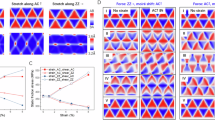 Notably, the adjacent center and edge also present opposite polarization direction (region I and II). The polarization vectors near the edge experience OOP down-up-down-up switching and keep the IP component direction the same (unusual Bloch-type). The schematic of OOP edge is given in Fig. 1D (z-x plane and perspective view), which is in accordance with both V- and L-PFM. By evaluating the L- and V-PFM results (Figs. 2 and 3), diagram can be built in 3D space, as shown in Fig. 1B. The polarization topology in t-BN possess a complex network like merons and anti-merons assembled in the edge of triangle moirés, and unusual Bloch-type domain walls at the edges (Fig. 1D). Distinguish from strong center polarization in conventional ferroelectric materials, it should be noted that polarization in t-BN system is more prominent in edge of moiré patterns. In addition to t-BN, similar phenomena including IP and OOP were also observed in twisted WSe2 (Supplementary Figs. S10, 11). Moreover, the complex polar topological structure is consistent in moiré patterns with different twist angles (twist angle≪1°) (Supplementary Figs. S12–15), indicating that such configuration is suitable for different moiré systems.