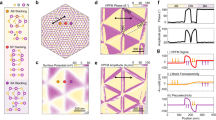 The t-BN samples are fabricated using the tear-and-stack method with both top and bottom layers of ~3 nm BN (Supplementary Fig. S2). The optical image is shown in Supplementary Fig. S3. The domain structures of the t-BN were characterized by PFM (Fig. 2A), in which the principle of lateral PFM is illustrated in Fig. 2B (principle of vertical PFM is given in Supplementary Fig. S4). When the tip encounters a region with different polarization vectors, it experiences a change in amplitude and phase of its vibration and torsion, which can be decomposed into two directions vertical (\(d{{{\rm{P}}}}_{\perp }\)) and parallel (\(d{{{\rm{P}}}}_{\parallel }\)) to the tip. The moirés in the region squared by the white dash in Fig. 2C is examined. It exhibits triangle moiré patterns with a length of 550–820 nm, and an edge width of ~100 nm (Fig. 2D, E). The lateral amplitude (L-Amp.) and phase contrast (L-Pha.) of each edge exhibit distinct behaviors when the scan angle between the tip and triangle’s sides changes. The L-amp. response is the weakest when the cantilever (gray polygon) is parallel to the edge, and the strongest when the components are perpendicular to the cantilever (red and blue dash arrows). Since the polarization can point in any direction in three-dimensional space, information about triangle lengths and PFM response directions must be consulted in order to fully determine the polarization distribution in t-BN.