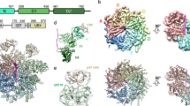 Given the potential of SPATA5, SPATA5L1, C1orf109, and CINP in promoting the dissociation of RLP24 from pre-60S ribosome in cytoplasm28, we tested the expression of these proteins individually in HEK293T cells. Unexpectedly, wild-type (WT) SPATA5 exhibited a significantly compromised expression level, compared with its Walker B mutant forms (catalytic E to Q, namely SPATA5D1EQ, SPATA5D2EQ, and double mutant SPATA52EQ) (Supplementary Fig. 1a). These mutations slow down or abolish ATP hydrolysis in most AAA+ ATPases but do not affect ATP binding10,31. Interestingly, different from SPATA5, both the WT and mutant forms of SPATA5L1 showed comparable expression levels (Supplementary Fig. 1a). Further co-overexpression tests in different combinations confirmed that the expression level of SPATA5L1 could be improved by co-expression with SPATA52EQ (Supplementary Fig. 1b), and there is also a mutual expressional promotion between C1orf109 and CINP (Supplementary Fig. 1b). To test whether these proteins could form a stable complex either alone or in combination, all the samples were purified using anti-FLAG affinity beads against the C-terminal 3 × FLAG tag of SPATA52EQ. Then, these samples were examined by size-exclusion chromatography (SEC) and negative-staining electron microscopy (nsEM). Firstly, SPATA52EQ alone showed no sharp peak, and proteins were distributed in all SEC fractions (Supplementary Fig. 1d, e). The nsEM analysis of peak fractions collected between 13.0 and 14.0 mL showed that these particles lacked the characteristic AAA+ ATPase hexameric arrangement and appeared to be aggregates (Supplementary Fig. 1f). Next, we co-expressed SPATA52EQ and SPATA5L1 and found that they also failed to form hexameric ring structures (Supplementary Fig. 1g–i). In sharp contrast, upon co-expression of SPATA52EQ, SPATA5L1, CINP and C1orf109, the SEC revealed two obviously separated peaks (Fig. 1a). The position of peak 2 indicates a molecular weight of approximately 650 kDa (Fig. 1a). SDS-PAGE and Coomassie blue staining of the fractions from the peak 2 showed that SPATA5 2EQ, SPATA5L1, C1orf109 and CINP indeed form a complex (Fig. 1b). The nsEM further demonstrated that many particles did display a hexameric ring structure (Fig. 1d), which is a typical feature of AAA+ ATPases10,31.