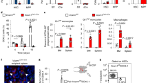 Since osteoclasts are known to promote angiogenesis36, we hypothesized that yolk-sac-derived osteoclasts regulate the establishment of the VCAM1+ sinusoids. To selectively ablate yolk-sac-derived myeloid cells we injected C57BL/6 J pregnant dams at E6.5 with anti-CD115 depleting antibody (Fig. 3a). This is an established protocol that ablates myeloid cells derived from the yolk sac while sparing hematopoietic cells produced by HSC, as HSC are specified later4,21,37,38,39. We then compared anti-CD115 (depleted, αCD115) and anti-IgG (control) litters at E18.5. anti-CD115 treatment led to loss of osteoclasts (Fig. 3a-c) and overall reduction in osteoclast size (Supplementary Fig. 7a). This size change is likely due to the replacement of the large yolk-sac-derived osteoclasts by smaller osteoclasts (which will be derived from HSC) throughout the bone marrow. In the anti-CD115 group, there was a ~ 2-fold reduction in the number of neutrophils but no other myeloid cells (Fig. 3b, d). FACS analyses demonstrated an almost complete loss of VCAM1 expression in the bone marrow endothelium and overall loss of endothelial cells and PDGFRβ+ stromal cells (Fig. 3e). Imaging analyses showed selective loss of VCAM1 and perturbed vessel growth in the diaphysis (Supplementary Fig. 7b-d). Unexpectedly, depletion of yolk-sac-derived myeloid cells led to de novo expression of VCAM1 in the metaphysis (Fig. 3b, f) and this correlated with de novo recruitment of neutrophils to this region (Fig. 3g). These results indicate that yolk-sac-derived myeloid cells promote vessel growth and VCAM1 expression in the diaphysis and suppress VCAM1 expression in the metaphysis, and that VCAM1 expression is sufficient to direct neutrophil colonization to specific regions of the bone marrow.