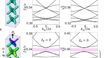Band structures of the 3D photonic AXI host a complete bulk bandgap from 11 to 11.7 GHz, as shown in Fig. 2b. In calculations, the equal but opposite magnetic bias is set to be \(\pm\)1920 Oersted (Oe) for YIG rods in B and A layers, respectively. The copper plates are treated as perfect electrical conductors. Detailed parameters refer to Methods and Supplementary Fig. 1.