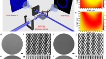 We first characterize two pairs of RCP and LCP 3D perfect vortices generated by the two SiC metasurfaces by using an experimental setup shown in supplementary Fig. S2. We capture 201 transverse intensity images of each 3D perfect vortex at 2 \({{\rm{\mu }}}{{\rm{m}}}\) intervals along the z direction, ranging from z = 0 \({{\rm{\mu }}}{{\rm{m}}}\) (i.e., the surface of the metasurface) to z = 400 \({{\rm{\mu }}}{{\rm{m}}}\). The 3D light fields of the four 3D perfect vortices reconstructed from these image sequences are shown in Fig. 2a. The 3D contours of these perfect vortices appear very similar. Additionally, we quantitatively compare the sizes of the x-y plane intensity distributions (Fig. 2b) of the four 3D perfect vortices at z = 300 μm and the cross sections of these in-plane intensity images along the white dashed lines are shown in Fig. 2c. A size growth factor η of two orthogonally polarized perfect vortices with topological charges of \({l}_{M}\) and \({l}_{N}\) is defined as: η = (\({d}_{{l}_{M}}-{d}_{{l}_{N}}\))/\({d}_{{l}_{N}}\), where \(|{l}_{N}| < |{l}_{M}|\), and d is the distance between the two points with the highest intensity on the white dashed line path, representing the size of optical beams along a certain direction. The distance d in the y direction is measured as, for SiC metasurface 1: 134.51 μm for perfect vortex 1 with \({l}_{1}\,\)= +15, 132.63 μm for perfect vortex 2 with \({l}_{2}\,\)= +5; for SiC metasurface 2: 134.95 μm for perfect vortex 3 with \({l}_{3}\,\)= −23, and 133.85 μm for perfect vortex 4 with \({l}_{4}\,\)= +8, respectively. The size growth factor η is calculated as: 1.42% for perfect vortex 1 and perfect vortex 2, and 0.82% for perfect vortex 3 and perfect vortex 4. To determine their topological charge numbers, we measure the 3D light fields of the interference patterns for the four generated 3D perfect vortices by using a setup shown in supplementary Fig. S3. The corresponding 3D views of these reconstructed interference patterns and their projections on the x-y plane (labelled XY view) are presented in Fig. 2d. The numbers of petals of the four interference patterns are 15 for perfect vortex 1, 5 for perfect vortex 2, 23 for perfect vortex 3, and 8 for perfect vortex 4, corresponding to the absolute values of their topological charges l of 15, 5, 23, and 8, respectively. The petal arrangement direction of perfect vortex 3 is opposite to that of the other three perfect vortices, indicating that its topological charge has the opposite sign compared to the others. These experimental results show that the sizes of the 3D perfect vortices generated by our method exhibit minimal change with increasing topological charge, suggesting that the customized intensity trajectories are largely independent of the vortices’ topological charges.