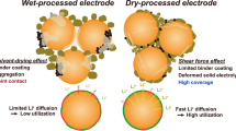 Electrochemical impedance spectroscopy (EIS) was performed with an applied potential of 10 mV from 7 MHz to 0.1 Hz by recording six data points per decade of frequency using Bio-Logic VSP-300. The measurements were conducted at quasi-stationary potential by applying open-circuit voltage time longer than 30 min. Direct current polarization (DCP) was performed with potential biases of 0.5 V and 0.05 V for e− transports in SSE layer and positive electrode layer, respectively, using the same equipment. EIS results were fitted using ZView software. Distribution of relaxation times (DRT) was performed by using techniques previously reported57. Internal resistance and shelf-life were collected using Neware Battery Cycler. For Li+ and e− transports in SSE, co-rolled film or positive electrode and SSE freestanding films were cut into a 10 mm diameter using a hand-held punch cutter with SSE side facing a die plate, placed in a 10 mm polyether ether ketone (PEEK) die and pressed at 500 MPa for 3 min with titanium plungers to form SSE|positive electrode configuration. For Li+ transport in the positive electrode, 60 mg of LPSCl was pressed at 300 MPa for 10 sec to make a supporting layer, and co-rolled film or freestanding positive electrode film and 60 mg of LPSCl were pressed at 500 MPa for 3 min to form SSE|positive electrode|SSE layers. 50 mg of Li0.5In (LiIn) powder, prepared by vortex mixing Li metal powder (FMC) and In metal powder (99.99%, MSE Supplies) of a stoichiometric ratio, was spread on both sides and pressed at 125 MPa for 1 min to form LiIn|SSE|positive electrode|SSE|LiIn electron-blocking cell configuration. For e− transport in positive electrode layer, co-rolled film with SSE layer peeled-off or freestanding positive electrode film was pressed at 500 MPa for 3 min. Li+ or e− conductivities were calculated using the following equation: \(\sigma=\frac{L}{R\times A}\) (1) where L is the thickness of SSE or positive electrode layer, R is the resistance obtained from EIS or DCP measurements, and A is the cell area. For EIS, R1 was used for Li+ transport in SSE, and sum of R2 and R3 was used for Li+ transport in positive electrode (Supplementary Fig. 20). For DCP, resistance was obtained by using the following equation: \(R=\frac{V}{I}\) (2) where V is the applied potential bias, and I is the current measured. Internal resistance test was conducted with Si|LPSCl|NCM82 configuration by cycling at 0.1 C from 2.5 to 4.25 V, charging to 3.7 V, and applying a pulse of different C-rates for 10 s and resting for 20 min. Shelf-life test was conducted with Si|LPSCl|NCM82 configuration by cycling at 0.1 C from 2.5 to 4.25 V, charging to 4.25 V, and resting for 100 h. Stack pressure test was conducted with LiIn|LPSCl|NCM82 configuration by cycling at 0.1 C and 2 MPa from 1.875 to 3.675 V, charging to 3.4 V, and conducting EIS by varying stack pressures monitored with a load cell calibrated with Instron Loadframe. All electrochemical characterizations were performed at the environmental temperature of 23 ± 1 °C and stack pressure of 75 MPa, unless specified, in Ar-filled atmosphere.