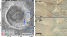 Using the mean number of streaks per detection (2.33), we estimate that one bright or dark slope streak detection modifies a surface area of ~0.1 km2, on average. This indicates that the detected slope streaks modify an area of 49,705–103,500 km2 globally, i.e., 0.03–0.07% of the martian surface (for \({{{{\rm{p}}}}}_{{{{\rm{D}}}}}\) and \({{{{\rm{p}}}}}_{{{{\rm{C}}}}}\), respectively). Considering a streak survival time of 3–20 MY (where streaks are observable3,4), the global surface modification rate would be 15,568 to 2485 km2/MY and 34,500 to 5175 km2/MY, i.e., 0.01–0.002% and 0.02–0.004% of the surface per MY (for \({{{{\rm{p}}}}}_{{{{\rm{D}}}}}\) and \({{{{\rm{p}}}}}_{{{{\rm{C}}}}}\), respectively). Considering a streak thickness of ~1 m (i.e., the maximum value derived by14,15, an average streak detection would modify a volume of ~100,000 m3 or ~0.0001 km3, which would result in a total modified volume of ~50 to ~100 km3 (for \({{{{\rm{p}}}}}_{{{{\rm{D}}}}}\) and \({{{{\rm{p}}}}}_{{{{\rm{C}}}}}\), respectively). Considering a dust bulk density of ~2500 kg/m3 or ~2.5 × 109 t/km335, the total modified mass would account for ~1.3 × 1011 to ~2.5 × 1011 t, i.e., ~4.2 × 1010 to ~6.3 × 109 t/MY and ~8.3 × 1010 to ~1.3 × 1010 t/MY (for \({{{{\rm{p}}}}}_{{{{\rm{D}}}}}\) and \({{{{\rm{p}}}}}_{{{{\rm{C}}}}}\), respectively). References 36,37 report that around 4.0 × 108 to 2.9 × 109 t/MY of dust is exchanged between the martian surface and atmosphere, i.e., between ~1 to ~46% and ~0.5 to ~22% of the dust mass modified by streaks (for \({{{{\rm{p}}}}}_{{{{\rm{D}}}}}\) and \({{{{\rm{p}}}}}_{{{{\rm{C}}}}}\), respectively). Reference 38 reports a total dust mass of ~4.3 × 108 t lifted during a global dust storm observed in 1977, which is ~1 to ~7% and ~0.5 to ~3% of the estimated mass modified by slope streaks per year (for \({{{{\rm{p}}}}}_{{{{\rm{D}}}}}\) and \({{{{\rm{p}}}}}_{{{{\rm{C}}}}}\), respectively). These estimates indicate that slope streaks move several dust-equivalents of a global dust storm every MY. The injection of dust into the atmosphere by slope streaks has not been observed yet, but would make slope streaks an important contributor to the martian dust cycle and climate, potentially accounting for a substantial fraction of the surface-atmosphere dust exchange budget.