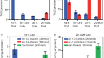 Three PUFA producers (engineered Y. lipolytica YlP56 for C20:5, Schizochytrium sp. for C22:6, and M. alpina for C20:4) were used to explore the differences in their FA profile changes. In particular, PUFAs were biosynthesized by the desaturase/elongase pathway in Y. lipolytica and M. alpina (Fig. 1a)19, whereas PUFAs were biosynthesized by the polyketide synthase (PKS) pathway in Schizochytrium sp. (Fig. 1b)20. As shown in Fig. 1c, the C16 and C18 FA contents (% total fatty acids, TFAs) of Y. lipolytica YlP56 continuously decreased with prolonged fermentation time. The contents of C16:0 and C18:2 significantly decreased from 28.4% and 34.8% at 48 h to 9.24% and 10.4% at 240 h, respectively. The content of C20:5 continuously increased, and the final content reached 40.5% at 240 h (Fig. 1c). The variation in the FA content of M. alpina R807 was similar to that of Y. lipolytica. The contents of C16:0 and C18:1 decreased from 18.6% and 21.7% at 48 h to 12.4% and 11.5% at 240 h, respectively, whereas the content of C20:4 continuously increased, and the final content reached 46.2% at 240 h (Fig. 1d). However, the FA profile of Schizochytrium sp. HX308 exhibited the opposite trend during fermentation. After 120 h, the contents of C14:0 and C16:0 continued to increase, whereas the content of C22:6 decreased from 48.7% at 120 h to 32.5% at 192 h (Fig. 1e). Moreover, the lipid titer and dry cell weight (DCW) of the three producers decreased at the later stage of fermentation (Supplementary Fig. 1a–c). For example, the lipid titer of the YlP56 strain decreased by 30.2%, from 31.8 g/L at 192 h to 22.2 g/L at 240 h; these results indicated that lipids were degraded at the later stage of fermentation.