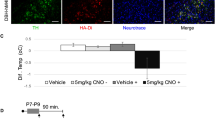 Neonatal injections: intracranial injections were performed at postnatal day 0–1, as in previous work94. In brief, mice were anaesthetised with 3.5% isoflurane (1 L/min) in an induction chamber, and were then kept under anaesthesia using a custom-designed nose cone95. With a Nanoject III injector (Drummond) and a motorised stereotaxic arm (MCI), animals were injected in S1BF (AP 1.4 ML 1.5 from lambda), penetrating through the skull (right hemisphere). Pups were injected with 300 nL of either AAV9.hSyn-g5-HT3.0 (WZBiosciences, titre ≥ 1 × 1013 v.g./mL), and AAV1.hSyn.GCaMP6s.WPRE.SV40 (Addgene, titre > 1 × 1013 v.g./mL). Injections of 100 nL were performed at a rate of 23 nL/s at 3 different depths from skull surface: 600, 450 and 300 μm. After ~20 s the capillary needle was extracted and the pups were placed on a Thermacage (Datesand technologies) for recovery. In order to remove surgical odours, pups were rubbed in nesting material before being returned to their dam.