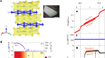 Despite the similar trend of Hc − θ, the actual magnetic reversal processes differ significantly between the 2D and bulk samples. It is worth noting that at the same temperature, the Hc of the 2D sample is significantly larger than that of the bulk sample (Fig. S10, Supplementary Information). The variation in the magnetic anisotropy energy after mechanical exfoliation alone cannot account for this difference, indicating a strong pinning effect in 2D samples. As shown in Fig. 4a, the magnetic reversal of device 2 exhibits a slow ramping behavior, while the bulk sample shows a steep jump accompanied by a long tail. The AHE shape of the bulk is consistent with the M − H curves (Fig. S1, Supplementary Information), suggesting that the AHE can effectively describe the entire sample’s reversal process. Based on the above observations, we can infer that the magnetic domains in 2D samples are strongly pinned and nearly uncorrelated with each other. The depinning energy of the domain wall is randomly distributed within a certain range, and when the Zeeman energy provided by the external field surpasses the energy barrier, the corresponding domain undergoes reversal. In other words, the domain walls are often pinned and therefore propagate at an extremely low velocity. Under this hypothesis, when the field rotates from the out-of-plane axis to the in-plane axis, the Hc of all the domains should follow the \(1/\cos \theta\) rule, where the width of the Hc distribution will also depend on the field angle as \(1/\cos \theta\). In Fig. 4c, we extracted the reciprocal of the AHE slope at Hc, defined as \({s}^{H}=| dH/d({V}^{H}/{V}_{0}^{H})|\). The sH of the 2D sample can be well-fitted by the \(1/\cos \theta\) function, perfectly confirming our conjecture. In contrast, the reversal of the bulk sample manifests as a sharp initial step even when the field is directed close to the in-plane direction. The extracted sH remains close to zero, implying that the reversal in the bulk sample can be described by domain nucleation followed by rapid propagation of the domain walls throughout the sample. The long tail observed at the end of the reversal likely originates from surface-pinned domains, since all 2D samples exhibit strong pinning behavior. The slight increase in sH at large θs may arise either from the broadening of the tail or the reduction of domain wall velocity under in-plane fields.