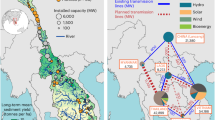 The power system model uses a direct current optimal power flow linear programme47 to minimise power system costs at each simulation time step (i.e., hourly) subject to equality constraints (power balance at each node) and inequality constraints (power generation and line limits). The power system model is an interconnected network of different energy sources, transmission lines, substations, distribution networks, and electricity demand locations. Energy generators can be represented as nodes in the network, each with their defined constraints, such as maximum power capacity and associated costs. The Ghana power system model simulates the existing and planned hydro, solar, combined solar and storage, wind, bioenergy, and thermal generators50. Electricity demand projections, generating resources, capital and operating costs of power plants and transmission lines, and hourly profiles of renewables were taken from Ghana’s Power System Master Plan50. Hourly electricity demand profiles and transmission data were collected from the Ghanaian national grid operator, the Ghana Grid Company. The long-term annual peak load projections for 2030-2040 from the Ghana Power System Master Plan50 were used to scale the hourly load profile of 2018 to consider the projected growth in the electricity demand in the country (a twofold increase in the peak demand by 2030 compared to 2018). Capital costs consist of engineering, procurement, construction, start-up, and owner costs (for items like land, cooling infrastructure, administration and associated building, site works, project management, and licenses)50. The operating costs of variable renewables (solar and wind) and combined solar and storage are lower than the costs of hydropower, bioenergy, and thermal power plants50. The operating costs of thermal generators also differ depending on the technology and fuel types. Hourly power system simulations help capture the variability of intermittent renewables (solar and wind) and energy demand, as well as improve the use of hydropower based on the changing availability of renewables and other energy sources. The power system model dispatches the system’s generators based on cost-merit prioritisation where solar, wind, combined solar and storage generators are dispatched first, then hydropower, bioenergy, and lastly, thermal generators. This balances energy production to align with variable energy demand and shares of different energy technologies.