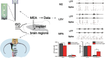 Mice (3−4 months old, 25−30 g) were anesthetized with isoflurane (3% for induction, 1.4% for maintenance) and stabilized in a stereotaxic frame (RWD Life Sciences, Shenzhen, Guangdong, China). Mice were subjected to bilateral intracranial viral injection into the VP (150 nl) (Coordinates: AP, + 0.38 mm; ML, 1.30 mm; DV, − 5.1 mm) or into the LC (120 nl) (AP: − 5.6 mm; ML: 0.9 mm; DV: − 3.8 mm) or into the LH (200 nl) (AP: − 1.05 mm; ML: 1.1 mm; DV: 5.1 mm). Optical fibers were implanted in or above the VP [AP, + 0.38 mm; ML, 1.30 mm; DV, − 5.1 mm (for fiber photometry) or −4.9 mm (for optogenetic modulation)], LC [(AP: − 5.6 mm; ML: 0.9 mm; DV: − 3.8 mm for fiber photometry or − 3.6 mm for optogenetic modulation), and LH (AP: − 1.05 mm; ML: 1.1 mm; DV: 5.1 mm). The mice were allowed to recover for 2 − 4 weeks before behavioral tests, optogenetic manipulation, electrophysiological recording, and morphological assay.