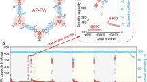 Battery performance was evaluated based on coin cells (CR2032 or CR2016). Free-standing organic electrodes and counter electrodes (LMO/CNT, NVP/CNT, NH4CuHCF/CNT, MgHCF/CNT, and Zn foil) were sandwiched by a glassy fiber separator (Whatman GF A, thickness: 0.26 mm, diameter: 18 mm, average pore size: 1.6 µm). For ZnSN and P-ZnSN electrodes, an ion exchange membrane was used as the separator50. Aqueous electrolyte were prepared for different systems including 4 M LiOTf for lithium-ion battery, 5 M NaNO3 for sodium-ion battery, 2 M H2SO4 for proton battery, 4 M (NH4)2SO4 for ammonium-ion battery, 2.5 M Mg(OTf)2 for magnesium-ion battery, and 2 M ZnSO4 for zinc-ion battery. Hybrid electrolyte based on 10% (v) of DMA (2 M ZnSO4-10%DMA) was also adopted for zinc ion batteries to suppress the severe dendrite growth of zinc metal under high rates and high areal capacities52. Lean electrolyte ranging from 100 to 400 μL is controlled to achieve a E/C value of 1.5–3 μL mg−1 according to the mass of positive electrode materials. Cells were assembled by the crimper at a pressure of ~5 MPa (5 s) and rested for 1–5 h before cycling. Cells were tested at 22 ± 2 °C without a climatic/environmental chamber.
