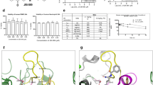 A virtual screen was conducted of the Pfizer compound library (4.3 M compounds) using a 2D fingerprint with data fusion29 methodology to identify compounds similar to the PAD4-selective ligand GSK14728 (Fig. 1a). The top scoring 1250 compounds were screened for inhibition of PAD4-mediated deimination of N-α-benzoyl-L-arginine ethyl ester (BAEE) through fluorescent detection of ammonia release at a single dose of 40 µM. Compound PAD-PF1 (Fig. 1a) was identified as a hit (56% inhibition) in this screen. Inhibition of PAD4 by PAD-PF1 was confirmed utilizing an orthogonal fluorescence quenching (FQ) assay employing a fluorescently labeled arginine-containing peptide substrate30. A Ca2+ ion concentration of 0.4 mM was employed in this assay to approximate the concentration yielding half-maximum activity (K0.5)31. Under these conditions, PAD-PF1 inhibited PAD4 in a dose-dependent manner with an IC50 of 15.9 µM (Fig. 1b). The binding affinity and kinetics of PAD-PF1 were measured using a surface plasmon resonance (SPR) binding assay employing immobilized bap-tagged human PAD4 enzyme. PAD-PF1 demonstrated rapid on/off kinetics of binding to PAD4 with a KD of 2.82 µM (Fig. 1c). Since PAD-PF1 was identified based on its 2D similarity with GSK147, the assumption was that PAD-PF1 was binding to the same pocket previously described28 and would demonstrate binding competitive with GSK147. In order to confirm this assumption, the binding affinity of GSK147 was determined by an SPR binding assay utilizing the standard running buffer (Fig. 1d) and where PAD-PF1 (10 µM) was added to the running buffer (Fig. 1e). Surprisingly, the affinity of GSK147 did not significantly change in the presence or absence of PAD-PF1 (KD = 0.380 µM and 0.469 µM, respectively) (p = 0.0754 student t test). This unexpected result suggested that PAD-PF1 was binding to a different binding site than occupied by GSK147 and that both ligands might bind simultaneously.