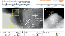 XPS depth profiling was performed to understand the evolution of the atomic fractions and the chemical state of the activated NSC. As shown in Fig. 3d, the S 2p spectra can be split into groups of undercoordinated sulfur (S1-) and saturated sulfur (S2-) peaks at 162.0 eV and 161.3 eV, and the surface (0 s) spectrum is the same as in Fig. 1f, with a weak peak corresponding to sulfate at 168.8 eV56. The sulfate peak disappeared after etching for 60 s, indicating that the complete oxidation of sulfur occurred on the near surface of the activated NSC particles only, possibly caused by the particles being exposed to air. The oxygen reactivity of the activated NSC can also be confirmed by EDS analysis. As shown in Fig. 2g, after activation for 240 min the oxygen content in the cross-section of the NSC particle aggregate increased from 2.7% to 10.7%. As shown in Fig. 3c, the O 1 s surface (0 s) spectrum can be split into three peaks corresponding to gangue silicate (O-Si)57,58, metal hydroxide (OH-) and metal oxide(O2-)59,60 near 532.8 eV, 531.8 eV and 529.9 eV, respectively. After etching for 300 s, the oxide surface of the NSC particle was removed, and the peak at approximately 530.9 eV was attributed to defective oxygen (O def)61,62. This is the result of oxygen atoms adsorbing on Ni and Fe vacancies in the process of structural disorder caused by mechanical activation63. As shown in Fig. 3b, the Fe 2p surface (0 s) spectrum can be split into five groups of peaks. The three groups of peaks at 708.1 eV, 710.7 eV and 713.1 eV are attributed to ferrous sulfide (Fe-S), ferric sulfide (Fe3+-S) and oxide (Fe3+-O), respectively. The other two groups are satellite peaks at 715.9 eV and 719.3 eV49,59,64. The Fe species of the bulk (300 s) NSC particles are consistent with those of the surface (0 s) but the proportion of sulfide inside is greater than that on the surface. As mentioned above, this phenomenon is caused by surface oxidation upon exposure to air. As shown in Fig. 3a, the Ni 2p surface (0 s) spectrum can be split into two groups corresponding to Ni hydroxide (Ni (OH)2) and sulfide (Ni-S) near 855.8 eV and 853.5 eV61,65. The surface Ni hydroxide is formed by the reaction of air-exposed bulk (300 s) Ni oxide (Ni2+-O), with a peak at 854.3 eV62. Thus, the evolution of the chemical state of activated NSC particles consists of the surface S species becoming partially completely oxidized due to air exposure while the bulk S species maintain their reduced state and have high oxidation activity. The surface metal species such as Ni oxide react with air to form hydroxides and the bulk Ni and Fe species were partially oxidized. Considering that the metal atomic sites in sulfides, such as Fe atoms, are the preferred sites for oxygen contact reactions66,67, the oxide species of Fe and Ni in the bulk of activated NSC particles are possibly derived from the metal defect sites generated by mechanical activation and adsorbing oxygen in the grinding tank. As shown in Fig. 3e, from the surface to the bulk of the particles (Etch 0–300 s) oxygen content decreases, while the content of S, Ni and Fe contents increase and then stabilize. Therefore, the outside-in oxidation characteristics of the activated NSC particles were confirmed by the evolution of the atomic fractions and chemical states.