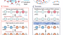 The highly developed renewable energy resources, such as solar and wind power, raise the demand for stationary energy storage, which is important for enabling stable energy output1. The merit of decoupled energy capacity and power output makes aqueous redox flow batteries (ARFBs) a promising candidate for adapting to grid-scale energy storage. In addition, ARFBs are much safer than the current Li-ion battery and have longer lifespan and lower maintenance costs2,3. However, the voltage output of ARFBs is low, which is limited to water splitting (theoretical splitting voltage 1.23 V).