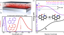 The Ce6T molecules in toluene have negligible emission from the S2 state upon excitation of the Soret band. The fluorescence spectrum is primarily a mirror image of the Q-band, with a maximum at 674 nm and a broad tail (Fig. 1C, dotted curve), as reported34. The emission bands have similar decay characteristics (Supplementary Fig. 3A, B) and lifetime (5 ns), confirming their identical origin. In contrast, the thin film emission peak is at 740 nm, and its intensity is four times larger than the band at 674 nm (Fig. 1C, solid curve). Unlike in solution, the two emission bands differed in their decay rate and characteristics, indicating the difference in their origin. The 674 nm emission band decays immediately with a lifetime of 790 ± 30 ps (Supplementary Fig. 3C), whereas the 740 nm band forms with a mono-exponential rise time of 200 ± 10 ps and decays in 1.1 ± 0.1 ns (Supplementary Fig. 3D). We attribute the sharp 674 nm emission to the Ce6T monomer, as in solution, while the 740 nm emission could be from the newly formed excited state species. The excitation spectrum of the thin film Ce6T (Fig. 1D, solid curve), recorded at the emission tail (770 nm), matched with the thin film absorption, indicating that the electronic excitations responsible for the emission are the same as that of absorption. The vibrationless emission, formation time, and long lifetime compared to the 674 nm band thus suggest that the origin of the 740 nm emission band is from an excimer-like state. We call it excimer-like37,38,39 because it shows the emission characteristics of an excimer, while we cannot exclude their ground-state interactions as evidenced by the 727 nm absorption peak. The preorganization and assembly of Ce6T molecules in the thin film results in (i) the coupling of the transition dipoles leading to the 727 nm absorption band and (ii) excimer-like emission upon photoexcitation. Thus, the 727 nm band in the excitation spectrum directly indicates the ground-state intermolecular interactions in Ce6T films.