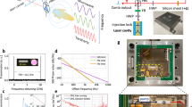 To elucidate the unexpected phenomenon where the comb’s repetition rate does not align with the linear cavity modes exhibiting maximum overlap with the SBS gain, we performed a linear stability analysis based on the modified LLE [Eq. (1)] including SBS effect (see Methods and Supplemental Information). The green curve in Fig. 4a represents the parametric gain spectrum described by Eq. (6). This curve reveals two key features: a sharp peak with the highest gain value, which corresponds to the SBS gain curve (red dashed line from Eq. (8)), and a broader and weaker gain band (approximately one order of magnitude lower) arising from a parametric interaction between Kerr and SBS effects. The maximum of this curve (labeled ωMax in Fig. 4(a) whose expression is given by Eq. (10)), results from a perfect compensation of the pump-sideband phase-mismatch via the combined action of the Kerr and SBS effects. To validate this interpretation, we remind that acousto-optic interactions in optical fibers induce both the amplification of a backward-scattered Stokes wave and a modulation of the refractive index through the electrostriction process51. The latter introduces a phase term, contributing to the phase-matching condition. It is highlighted in Fig. 4d, where we plot the approximated phase-mismatch relation Eq. (9), enabling to isolate the parametric process for the SBS gain one. The interaction between Kerr and SBS enables a perfect phase matching near 10 GHz (green curve in Fig. 4d), while eliminating the SBS contribution would give no solution, as it can be seen by the non-zero asymptotic value of the mismatch (f.i. around −14 GHz in the figure), where the Brillouin effect is vanishing, see Eq. (9). Notably, the approximate solution (dashed red line from Eq. (9)) closely matches the exact one (green curve from Eq. (7)). The imaginary part of Eq. (7) represents the standard SBS gain profile (light blue curve). Hence, the linear stability analysis highlights two critical contributions to the process: (i) the conventional SBS gain mechanism (imaginary part of Eq. (7)) and (ii) an additional parametric contribution arising from the interplay of Kerr and SBS-induced phase effects (real part of Eq. (7)). This extended gain bandwidth allows overlap with several cavity resonances (blue circles, N = 8 to N = 11 in Fig. 4a). The ninth resonance (N = 9), exhibits the largest gain, compared to the eighth, tenth and eleven ones, thereby selecting a frequency component that does not overlap with the standard SBS gain curve. Thus, energy from the pump is transferred to this selected frequency through this parametric process, generating signal and idler waves symmetrically located around the pump. This results in pump intensity modulation at a frequency that is an exact multiple of the cavity FSR (N = 9 in this case). The cavity thus behaves as a resonator coherently driven by an intensity-modulated pump, eventually leading to shock wave formation, significantly broadening the pump spectrum18,44,45,46,47,48. It is important to note that the spectral bandwidth can be controlled by tuning the fiber dispersion. Since this parameter has a negligible impact on the parametric process, the teeth spacing remains unchanged. However, the positions of the shoulders associated with SWs can be adjusted, enabling control over the comb’s spectral width. This tuning allows for the adjustment of the comb width while maintaining a constant teeth spacing of 10 GHz, thereby enhancing the power spectral density of the comb (see supplemental materials). A deeper insight into the dynamics of the process is provided in Fig. 4b, c, e–g, which illustrate the system’s behavior under varying cavity detuning (Fig. 4b, c) and input pump power (Fig. 4e–g). Figure 4b represents the tilted transfer function of the cavity for a pump power Pin = 0.8 W. Figure 4c shows a false-color plot the parametric gain as a function of frequency for operating points on the upper branch of the tilted transfer function calculated from Eq. (6). As illustrated above, for parametric instability to arise, the gain must overlap with a cavity resonance. This condition is satisfied over a specific range of cavity detuning. The minimum value (labeled δmin in Fig. 4b) is defined by the intersection between the marginal stability curve (black curve in Fig. 4c) and one cavity resonance (dashed black line). The maximum detuning coincides with the tip of the tilted resonance (labeled δmax in Fig. 4b). This highlights the necessity of operating with large enough detuning values to achieve a sufficiently high intra-cavity power. Figure 4e shows the bistable function for a cavity detuning set to δ = 0.083. It is well-established that the upper and lower branches of the bistability curve can exhibit modulational instability depending on the cavity parameters, whereas the negative slope region cannot support any steady-state solutions52. This forbidden region is highlighted in Fig. 4e–g by the dashed area. In the standard case of normal dispersion without SBS, although the linear stability analysis predicts the existence of parametric gain in this region, the system cannot be operated in this zone and instability is observable on the lower branch only53, as shown in Fig. 4g. When SBS is included, the parametric gain is significantly modified around the SBS gain band (approximately 10 GHz). This modification enables the existence of gain on the accessible upper branch, as depicted in Fig. 4f (for better presentation the unaffected portions of the parametric far from the SBS band are not shown).
