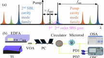 Figure 1a depicts the experimental setup. A CW laser with a central wavelength of 1550 nm is used to pump a FFP cavity of 8.75 cm length. This FFP cavity consists of a segment of a single mode normal-dispersion fiber at the pump wavelength and is connected to the rest of the setup using standard FC/PC connectors. The linear transmission function of the resonator is measured and shown in Fig. 1b. The FSR of the cavity is determined to be 1.176 GHz, with a resonance’s full width at half maximum (FWHM) of 2.8 MHz (see inset). This results in a finesse of 420 and a Q-factor of 69 millions. The cavity is stabilized through a feedback loop system which makes the laser pump to compensate for the cavity fluctuations. The measured gain curve of the SBS process, is displayed in Fig. 1c. This curve shows a central frequency shift of 9.655 GHz relative to the pump and a FWHM of around 50 MHz. It corresponds to typical values given for heavily germanium doped highly nonlinear fibers40. As can can be seen in Fig. 1d, the SBS gain curve is situated between two resonances of the cavity (between N = 8 and N = 9), without significant overlap.
