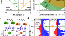 fk = ∑δeik⋅δ, and z1 = 3 are the number of intra-plane nearest-neighbors, fac⊥,k = fbd⊥,k = ∑γeik⋅γ, \({f}_{ad\perp,{{\bf{k}}}}={\sum }_{{{\boldsymbol{\gamma }}}}{e}^{i{{\bf{k}}}\cdot {{{\boldsymbol{\gamma }}}}_{-}}\), \({f}_{bc\perp,{{\bf{k}}}}={\sum }_{{{\boldsymbol{\gamma }}}}{e}^{i{{\bf{k}}}\cdot {{{\boldsymbol{\gamma }}}}_{+}}\), and z⊥ is the number of interlayer A–C next-nearest-neighbors. γ∓ correspond to the interlayer nearest-neighbor vectors for A-D sublattices (– sign) and B–C (+ sign) sublattices. The magnon energies are obtained by diagonalizing \(\hat{g}{{\mathcal{D}}}({{\boldsymbol{k}}})\) numerically, where \(\hat{g}=[1,1,1,1,-1,-1,-1,-1]\)50. The presence of a spin-wave gap at the Γ point lies beyond the XXZ model, and its origin is still under debate17. Here, we add a phenomenological term of the form \({H}_{\eta }=\frac{\eta }{2}{\sum }_{i,{{\boldsymbol{\delta }}}}\left({\tilde{S}}_{i}^{y}{\tilde{S}}_{i+{{\boldsymbol{\delta }}}}^{y}-{\tilde{S}}_{i}^{x}{\tilde{S}}_{i+{{\boldsymbol{\delta }}}}^{x}\right)\), which leads to a gap at the Γ point. We used η = 0.05 meV, which reproduces the low magnon energy of ~1 meV observed in neutron scattering measurements16,17.