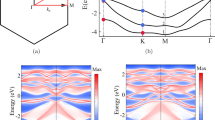 The proof that the hydrogenated Bi layer is indeed a true 2D bismuthene layer comes from the determination of the electronic structure by means of ARPES. The results of these measurements are shown in Fig. 2d–h. From the E-kx energy-momentum band map shown in Fig. 2d it is evident that the weakly dispersing band discussed above for the non-hydrogenated precursor phase has vanished, and instead, strongly dispersing Dirac-like bands emerge close to EF between the \({{{{\rm{M}}}}}_{\sqrt{3}}\) and the \({{{{\rm{K}}}}}_{\sqrt{3}}\) points. In the close-up shown in Fig. 2f, these bands are even more clearly visible. The white dashed lines represent density functional theory (DFT) calculations for the QSHI state of bismuthene (see Supplementary Information, Section 3 for details). The steep bands next to them, labeled G-replica and crossing the Fermi level just to the right of the \({{{{\rm{K}}}}}_{\sqrt{3}}\) point, are the replica of the graphene Dirac cones, backfolded due to the SiC lattice31 and partly covering the bismuthene bands. Note that the replicas are not observed for the precursor phase (Fig. 1b) since the (\(\sqrt{3}\times \sqrt{3}\)) R30° superstructure of the β phase requires a second-order process to produce scattering in this range of the k-space, making its intensity very small. On the bismuthene sample, however, some parasitic hydrogen-intercalated QFG domains exist (see Discussion below), which are (1 × 1) reconstructed and produce intensity of the G-replica in a first-order scattering process. The upper one of the bismuthene calculated bands (upper white-dashed line) matches very well with the left of the Dirac-like bands visible in the ARPES data (marked Bi in Fig. 2f), while the lower band is better seen in an E-ky-map perpendicular to the maps shown in Fig. 2d, f. Figure 2g shows such a perpendicular map through the position marked by the black dashed line labeled g in Fig. 2f. The splitting of these upper and lower Dirac-like bands, best to be seen in Fig. 2g, is a Rashba-type spin splitting, as demonstrated by the DFT calculations detailed in Section 3 of the Supplementary Information, and is thus ascribed to the inversion symmetry breaking at the interface. We also mention that the peak shapes of XPS measurements confirm that the bismuthene phase is metallic, in contrast to the precursor phase, which is insulating (see Supplementary Information, Section 4 for details).