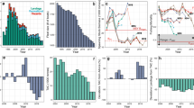 For nearly all climate phases identified with the NLCI, there is a good correspondence between the atmospheric large-scale SLP patterns, the regional NL climate and, where data are available, the productivity of the ecosystems determined by the mean level of primary and secondary production, as well as the trends in surplus groundfish biomass and multispecies biomass density. For example, during warmer phases of the climate (Fig. 3a–h), primary and secondary production levels were generally above average, and the three biomass metrics described above increased (mostly orange numbers). In contrast, during the colder phases of the climate (Fig. 3i–p), primary and secondary production levels were generally below average, and the three biomass metrics described above decreased (mostly blue numbers). Exceptions include above average primary production during the cold 2007–2009 phase (Fig. 3m) and near-average abundance of Calanus finmarchicus during the warm 1999–2006 phase (Fig. 3f). Furthermore, the evidence for the importance of climate phases in trends in capelin biomass is not as compelling as that of groundfish and multispecies biomasses. Specifically, although the capelin biomass is marked by a decline during the groundfish collapse phase (1982–1998; Fig. 3k), its biomass increased between 1982-1990 before collapsing in 1990-1991 (Supplementary Fig. 3). The reasons for this increase in capelin biomass in the 1980s are unclear. It may be associated with a reduction in predation pressure when groundfish stocks began to decrease in the mid to late 1980s13. Alternatively, capelin stocks may have had reduced spatial overlaps with their predators during the cold 1980s44, but then the capelin also collapsed during the very cold anomaly of 1990–1993. Trends in capelin biomass were also not significantly different from zero during the 1999–2006 and 2007–2009 climate phases, unlike the trends in the groundfish and multi-species biomasses (Fig. 3f, m). However, the SLP patterns during these two phases did not exhibit clear positive or negative signals centered around the pole as seen in other phases, which corresponded to rapid fluctuations of the NLCI (especially during the 1999–2006 phase). This may suggest changes in predation dynamics upon capelin or that the species responds more rapidly to environmental changes.