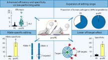 HEK4-2 and CDH4 potential off-target loci were obtained from the ref. 36. Off-target loci of FANCF and HIRA were analyzed by Cas-OFFinder37 where potential off-target loci containing the most similar sequences of selected target loci were chosen as predicted off-target sites. The off-target effects were evaluated through the indel frequency and intended nucleotide conversion at tested off-target loci5. Briefly, reads were aligned to corresponding off-target reference sequences and each off-target amplicon sequence was compared with the 3’ DNA flap sequence encoded by the rpegRNA/pegRNA extension. Any reads with this nucleotide converted to that on the 3’ DNA flap were considered off-target, which were calculated from the output file “Nucleotide_frequency_summary_around_sgRNA”. These off-target sites and the associated primers are listed in the Supplementary Data 4.