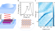 In contrast to planar cavities, which allow angle-tuning due to their continuous, quasi-parabolic dispersion, the discrete, dispersion-less nature of the localized LG states necessitates the direct measurement of the anti-crossing characteristic in the strong coupling regime via bringing the exciton and the cavity modes into resonance through tuning of the cavity length1,54. The sample was illuminated by means of a broadband white-light source with the beam focused on top of the Gaussian deformation. The spectral transmission linewidth measured far from the excitonic resonance is about ~5 meV FWHM, corresponding to a photonic resonator quality factor of Q ~ 500. To demonstrate that the system is in the strong light–matter coupling regime, we recorded transmission spectra while tuning the length of the cavity by changing the air gap in situ (Fig. 1b, Supplementary Figs. 5 and 6). The measured spectra are composed of spatially confined LG modes arising from the Gaussian-shaped potential and the PC mode (highest in energy) (Supplementary Fig. 7). By energetically tuning the photonic modes through the exciton resonance, we observe the characteristic anti-crossing behavior of the lower polariton (LP) and upper polariton (UP) branches when entering the strong-coupling regime. We obtain Rabi splitting values of 2ΩPC = (53 ± 2) meV and 2ΩLG00 = (60 ± 2) meV for the PC mode and the lowest-energy Gaussian mode, respectively, by fitting the data with a coupled-oscillators model. As the air-gap length is not directly measurable in the experiment, the extracted polariton dispersion is compared to a transfer-matrix model simulation to precisely determine the cavity length L (Supplementary Figs. 7 and 8), which we define here as the size of the air gap plus the QD film thickness of 245 nm but excluding the exponential decay length within the DBRs.