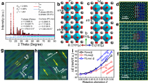 The characteristics of R-NaNbO3 include the presence of both \(\frac{1}{2}\) oo0p (o = odd, and the subscript p stands for the prototype perovskite unit cell) reflections from in-phase octahedral rotation (c+ in Glazer notation), which vanish in the room-temperature P phase, and the satellite reflections indexed by the modulation wavevector q = \(\frac{1}{\lambda }\) q010 (λ ≥ 4) (Supplementary Fig. 1b)28,29. The transition between R and P phases is also characterized by the dielectric anomaly at ~360 °C in pure NaNbO3 (Supplementary Fig. 1a). To explicitly resolve the structure of R-NaNbO3 using STEM, we face two peculiar challenges: (i) its stable temperature range of 360−480 °C requires high-temperature STEM imaging, whose image resolution may degrade due to in situ heating; (ii) its incommensurate structure modulation with illy-defined and potentially fluctuating periodicities. Composition engineering is thus exploited to overcome these issues. Firstly, we stabilize R phase down to room temperature by alloying a paraelectric material such as CaTiO331, which simplifies our experimental characterization. Secondly, we tune the modulation wavevector from incommensurate ~\(\frac{1}{12.3}\) q010 to commensurate \(\frac{1}{4}\) q010 by 1.5 mol% Mn doping (Supplementary Fig. 3), which further erases the complexity associated with the incommensurate modulation. The obtained Mn-doped (NaNbO3)0.85(CaTiO3)0.15 exhibits all the characteristic diffraction signals of R phase, which persist from room temperature up to 450 °C (Supplementary Fig. 4). At last, due to the low Z-contrast (Z is the atomic number) of Na (Z = 11) compared to Nb (Z = 41) in annular dark-field (ADF) STEM imaging, we partially substitute Na with Ag (Z = 47) to enhance the contrast of A cations (Supplementary Fig. 5), enabling more reliable determination of atomic positions and displacement. Despite the subtle ionic size difference between Na+ and Ag+, a proper amount of Ag substitution does not change the characteristic structure of R phase (both with and without Mn doping, see Supplementary Fig. 6). The obtained ceramics clearly exhibit multidomain structure with a domain size of hundreds of nanometers, as revealed by TEM analysis in Supplementary Fig. 7. Atomic-scale elemental mapping in STEM does not reveal any cation segregation in our samples (Supplementary Fig. 8), indicating that the modulation is purely displacive without chemical separation. All the steps involved in the synthesis of Mn-doped (Na0.65Ag0.20Ca0.15)(Nb0.85Ti0.15)O3 allow us to perform room-temperature characterization on the commensurately modulated structure of R phase.