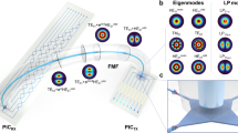 In Fig. 4d we present the corresponding iso-intensity surfaces displaying the spatial patterns of the LP modes in the predefined temporal order. We tailor the first element to exhibit positive vorticity \(\left({{\ell}}_{1}=1\right)\) and a negative cubic chromatic function (parabolic-like shape pointing to the left of the map). The second pulse has negative vorticity \(\left({{\ell}}_{-1}=-1\right)\) and a constant phase. The third element has no vorticity \(\left({{\ell}}_{0}=0\right)\) and a negative quadratic chromatic function (negative slope). Notice, the chromatic function imprinted on the modes was chosen arbitrarily, and their realization is meant to demonstrate the potential of our system to manipulate the spectral content of the constituent modes. Figure 4e shows the imposed frequency functions for each component. The spatial profiles in Fig. 4f demonstrate the transition of the LP mode content across different spectral/temporal regions. These results clearly demonstrate that our platform can establish a new design paradigm for ultrafast fiber applications and fiber amplifiers.