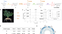 For squalene extraction plant material was ground in a Retsch II homogenizer and extracted in 500 µL of saponification solution (ethanol:water:KOH = 9:1:1, v:v:w) for 2 h at 65 °C with intermittent agitation. 250 µL of water was added to the samples before adding 500 µL of hexane. Samples were vortexed, centrifuged and 350 µL of the upper hexane phase was transferred to a glass vial and evaporated using a GeneVac personal evaporator (Genevac, Ipswich, UK). The dried extract was derivatised using a mixture of pyridine (60 μL), N-methyl-N-(trimethylSilyl)trifluoroacetamide (MSTFA, 30 μL) and trimethylsilyl chloride (TMS, 1 μL) for 1 h at 50 °C. A total of 1 μL of the derivatised extract was analysed by GC-MS using an Agilent 6890 Gas Chromatograph GC, (Agilent Technologies UK Ltd, Cheadle, UK) linked to a LECO Pegasus IV Time of Flight Mass Spectrometer TOF-MS, (LECO Instruments, Stockport, UK). The GC oven was fitted with a Restek Zebron ZB-5HT Inferno TM 30 M, capillary column (30 m, 0.25-mmID, 0.1 μm film thickness). Helium carrier gas was used at 1 mL/min constant flow and the transfer line temperature was set to 250 °C. The oven temperature was set at 80 °C for 5 min and then increased to 270 °C at a rate of 12 °C min−1 followed by increase to 310 °C at a rate of 6 °C min-1. Mass spectral data were acquired over the m/z range of 50 to 500 in positive electron ionization mode at −70 eV with an acquisition rate of 20 spectra/second and a 5 min acquisition delay. Data were acquired using ChromaTOF software v. 4.50.8.0 (LECO Instruments, Stockport, UK) Squalene was quantified against an external standard curve, constructed from a commercial squalene standard (Sigma, cat. No. S3626), treated in the same way as extracts, using extracted ion m/z 69, and presented in Figs. 2 and 4. Squalene peak from the plant extracts had nearly identical m/z profile to the commercial squalene standard as shown on Supplementary Fig. 3C. ChromaTOF software output “.cdf” files were converted to “.raw” files and data analysed using Thermo Xcalibur software v. 4.0.27.10 (Thermo Fisher).