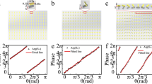 Metasurface technology exploits the phase shift between the incident and scattered radiation of optical resonators that are placed across the interface. The design approach requires spatially distributing the resonators with different geometries to introduce a discontinuous phase profile in agreement with a user-defined wavefront. Here, we provide proof-of-concept wavefront engineering in co-circular polarization by choosing and distributing the meta-atoms to realize phase gradient metasurfaces with an aperture size of 187 × 187 mm operating at 10 GHz. The first result exploits the anti-symmetric co-polarized phase depending on the input helicity, refracting \(|R\rangle\) and \({|L}\rangle \,\) waves at −30° and +30°, respectively, as schematically shown in Fig. 4A. The gradually varying phases as a function of the spatial x-position is obtained using numerical solutions representing the meta-atoms’ transmission properties, as shown in Fig. 4B, which indeed indicate that both \(|R\rangle\) (red) and \({|L}\rangle \,\) (blue) co-polarized channels are imposing opposite discontinuous phase values. The experimentally measured normalized far-field patterns presented in Fig. 4C show the anti-symmetric refraction angles, which decrease as a function of the frequency within 8–12 GHz. At 10 GHz, the refraction angles of θt+ and θt− are consistent with the ideal anti-symmetric refraction, demonstrating that such an intriguing behavior, identical to the conventional P-B phase, can also occur on the co-polarized channels. As mentioned in various examples in the literature related to the P-B phase, it is possible to further decouple such anti-symmetric response by introducing an additional phase modulation mechanism, such as the dynamic phase. Indeed, by simply tuning the size of the meta-atoms while fixing the relative rotation angle of the structure’s patches, the co-polarized singular phase can be preserved. This combination of phases is used to design an asymmetric refractor (Fig. 4D) presenting decoupled and independent phase gradients, indicated as Φ++ and Φ−− in Fig. 4E, for both \(|R\rangle\) and \({|L}\rangle \,\), respectively. Here, we arbitrarily considered a metasurface design with refraction angle θt+ = −15° and θt− = 45° in the two channels at the operation frequency of 10 GHz. The experimentally measured normalized far-field patterns associated with both channels are depicted in Fig. 4F, showing refraction angles in agreement with the design and exhibiting high transmission efficiency (see supplementary text S5). In addition to the demonstration of anomalous refraction using asymmetric one-dimensional phase gradients, we achieved arbitrary and decoupled co-polarized engineering of complex wavefronts, as often reported using two-dimensional phase profiles, including OAM generation from co-polarized singular geometric phase (see supplementary text S6). Here, the generated OAM does not result from helicity reversal, and consequently, the total angular momentum is not conserved in the co-polarized transmission channel. OAM is achieved by strategically placing the co-polarized phase elements in a vortex-like spatial phase distribution, and as a result, this process can be utilized to exert torque on the spiral phase plate27.