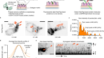Line scans were drawn from the top of stereocilia down the center of stereocilia. In Figs. 2b, d, 3b, c, the peak level in green channel was set as 0 on x axis and the fluorescence intensity was normalized to the maximal fluorescence intensity of row 1. In Fig. 3g, the stereocilia tip was defined as being the point where phalloidin intensity reached the mean value of fluorescence in the tip region. The fluorescence intensity was normalized to the average fluorescence intensity of line scan values in each channel. In Fig. 6c, the peak level in RFP channel was set as 0 on axis and the fluorescence intensity was normalized to the maximal intensity in each channel.