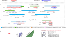 To further confirm the prevalence of nrEVEs in individual spiders, we purified genomic DNA from the collected A. ventricosus spiders and subjected them to high-throughput sequencing. Sequencing quality was confirmed by mapping the reads to A. ventricosus reference assembly scaffolds (accession number: BGPR01), with an overall alignment rate of 82%. The alignment details of the top nine scaffolds (AvEVE1-9), which contained the highest numbers of the distinct baculoviral homologs, were presented in Table 1 and Supplementary Fig. 3. Notably, the reference genomic assembly of A. ventricosus was generated from an individual spider captured in Yamagata, Japan, while our sequencing data was generated with an individual spider captured in Nanyang, China. The variation of gene coverage in some AvEVEs, suggests that the pattern of the nrEVEs is not fixed in the population of spiders. These nrEVEs showed different gene organizations, suggesting they may have been derived from multiple integrations and recombination events (Supplementary Fig. 3). We also noticed substantial single nucleotide polymorphisms in these AvEVEs, and the ratio (Ka/Ks) of the non-synonymous substitution rate (Ka) and synonymous substitution rate (Ks) of intact ORFs between our AvEVEs sequences and the reference assemblies were analyzed. The result revealed that the ORFs in the AvEVEs underwent strong purifying selection32 (Fig. 4c). Moreover, we performed PCR assays to identify the presence of baculoviral homologs (lef-8, p33, pif-0, and pif-1 of AvEVE2 and lef-9, pif-5, vp39, and 38k of AvEVE3) in the five A. ventricosus individuals. Remarkably, these genes were consistently detected in all the tested spiders, regardless of sex, indicating the existence of AvEVEs in A. ventricosus genome (Supplementary Fig. 4).