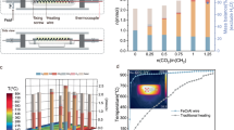 In the initial stage screening and optimizing reaction conditions, the reactor was composed of a T-type quartz tube, two sets of metal flange equipped with a ball valve and an electrode, and a metal blind flange as reactant inlet (Supplementary Fig. 1, the detailed information was presented in the part of Methods. Warning: experimental operator must take personal protective equipment). The T-type quartz tube has the following dimensions: a main tube length of 100 mm, a side arm length of 50 mm, an outer diameter of 25 mm, and an inner diameter of 19 mm. Therefore, the thickness of the quartz tube wall is 3 mm, which can tolerate moderate pressure during the experiment. In this study, the product yields are calculated relative to the elemental content of the plastic reactant as the theoretical yield, enabling direct evaluation of elemental recovery efficiency from plastic feedstock. Consequently, in the PE wet reforming reaction, the theoretical H2 yield may exceed 100% when the CO yield surpasses 50%. The contribution of water to hydrogen production can be quantified through either the CO yield or the difference between H2 and CO yields (H2 yield–CO yield). When using 14 mg PE powder (which can be considered as 1 mmol CH2) as a model plastic reactant, it requires at least 1 mmol H2O to convert into H2 and CO. Therefore, 14 mg PE and 20 µL H2O were initially added to the Joule heating reactor. As a heating component, a length of heating wire (2 Ω) was installed in the reactor, and a current of 7 amperes flowed through the heating wire. The temperature in the reactor can instantly reach 800 °C. After 12 min, 0.70 mmol CO and 1.22 mmol H2 can be obtained, which corresponds to the H2 and CO yields of 122% and 69%. In addition, 0.003 g residual carbon and trace amounts of CO2 were detected, with the carbon balance reaching almost 100% (Fig. 2a). The detailed calculation for carbon balance is presented in the Supplementary Tables 1–3. To fully utilize the carbon elements in PE, excessive amounts of H2O should be added. In the presence of 30 µL H2O, 0.99 mmol CO and 1.74 mmol H2 can be obtained, which is close to the theoretical yields and achieves an ideal carbon balance. The yields of H2 and CO reach 174% and 99%, respectively. When the amount of H2O was further increased to 50 µL, 0.063 mmol CO2 was detected, corresponding to a decrease of CO yield from 0.99 mmol to 0.89 mmol, and a maintenance of the H2 yield at approximately 172%. This indicates that a small amount of water reacted with CO to produce CO2 and H2 even in the presence of excess H2O, further demonstrating the high selectivity of the reforming system to syngas. Ultimately, 30 µL was selected as the optimal dosage for reforming 1 mmol of CH2 in plastics to syngas in the subsequent research. In addition, the heating wire in the Joule heating reactor is a key component for providing the high temperature. The diameter of the heating wire determines the resistance value per unit length and its tolerance to the maximum current (Supplementary Fig. 2 and Supplementary Table 4). The thinner heating wire has a higher resistance value per unit length, but a lower tolerable maximum current. The thicker one has a smaller resistance value per unit length but a larger tolerable current. When the resistance value of the heating wire was set at 2 Ω across different diameters and the maximum tolerable current was applied, the reforming performance varied with the heating wire diameter. It was found that the syngas yield was proportional to the power of the heating wire (Fig. 2b). When the power was kept at 100 W for each heating wire with different diameter and the maximum tolerable currents were selected (the length and resistance value are different for different heating wires), the syngas productions on different electrified heating wires were almost the same (Fig. 2b). However, if the current flow through the heating wire was not large enough to keep the heating wire in a red-hot state, the syngas yield was not ideal despite a power of 100 W. These findings indicate that both the power and the maximum working current of the heating wire are key factors that affect the reforming performance. Specifically, the heating wire should be in a glowing state and have enough power to reach a high temperature in the reactor and thus promote the reforming of PE and water into H2 and CO.