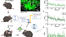To perform DA-neuron specific optogenetic activation of the VTA-NAc pathway for patch-clamp or tetrode recordings, we used 8-week-old DAT-Cre mice, in which Cre recombinase expression is restricted to DA neurons without disrupting endogenous dopamine transporter (DAT) expression58,59. We injected ssAAV-retro/2-hEF1a-dlox-hChR2(H134R)_EYFP(rev)-dlox-WPRE-hGHp(A) (5.4 × 1012, v214-retro, VVF Zurich) in the 3 subregions of the NAc (200 nl each site: NAcMSh: bregma 1.78 mm, lateral 0.45 mm, ventral 4.1 mm; NAcCore: bregma 1.55 mm, lateral 1.0 mm, ventral 4.0 mm; NAcLSh: bregma 1.45 mm, lateral 1.75 mm, ventral 4.0 mm) and we waited 3 weeks before recordings.