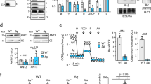 We attempted to determine the H+/ATP ratio of the δΔN-α fused FoF1 through biochemical measurements of the thermodynamic equilibrium between pmf and \(\Delta {G}_{{{{\rm{ATP}}}}}^{,}\), as previously reported17. Firstly, we prepared the FoF1-reconstituted proteoliposomes (PLs) and incubated them in an acidic buffer. The PLs were injected into the base assay medium to initiate ATP synthesis. The ATP synthesis/hydrolysis activity was monitored with the luciferin/luciferase assay system under various pmf conditions, with a given reaction quotient, Q \((=\left[{\mbox{ATP}}\right]/\left(\left[{\mbox{ADP}}\right]\cdot \left[{\mbox{Pi}}\right]\right))\). Figure 4a shows the time courses of the assay, in which the initial rate was determined. Figure 4b shows the reaction rates plotted against the pmf when Q = 2.5. The δΔN-α fused FoF1 was shown to catalyze the ATP synthesis reaction even at low pmf, at which wild-type FoF1 is unable to synthesize ATP. For a more quantitative analysis, the data points were fitted with an exponential function to determine the equilibrium pmf (pmfeq), where the torques of F1 and Fo are balanced and the net reaction rate is zero. At the condition of Fig. 4b where Q = 2.5, pmfeq was determined to be 68 mV for the δΔN-α fused FoF1 and 133 mV for the wild-type. Thus, the minimum pmf for ATP synthesis was halved for the δΔN-α fused FoF1, suggesting that the functional H+/ATP ratio of the δΔN-α fused FoF1 is also doubled, in agreement with SDS-PAGE analysis. For further confirmation, we determined the pmfeq at various Q values (Supplementary Fig. 3). Under all conditions, the pmfeq of the δΔN-α fused FoF1 was nearly half that of the wild-type.