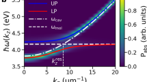 Due to their hybrid light-matter nature, EPs can propagate along the in-plane direction of the cavity with group velocity \({v}_{{{\rm{gr}}}}^{{{\rm{LP/UP}}}}=\partial {\omega }_{{{\rm{LP/UP}}}}/\partial {k}_{x}\), where ωLP/UP denotes the dispersion relation of the upper polariton branch (UPB) and lower polariton branch (LPB). The polariton dispersion, group velocity, and exciton content in the absence of vibronic coupling are shown in Fig. 1c–e, and play a vital role in our analysis.