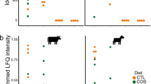An initial group of 80 steers (castrated males) representing two breeds of Bos taurus beef cattle (Aberdeen-Angus cross (AAX, n = 40), and Luing (n = 40)) was selected for the experiment. Of these, 71 (AAX: n = 36; Luing: n = 35) successfully completed the designed sampling scheme. All animals were provided a typical basal diet consisting of whole crop barley (300 g/kg DM), grass silage (200 g/kg DM), barley (355 g/kg DM), maize dark grains (120 g/kg DM), molasses (15 g/kg DM) and minerals (10 g/kg DM). Feed was offered to animals on an ad libitum basis. For half of the animals, the experimental design originally involved supplementation with Asparagopsis taxiformis red algae vegetative tissue (thallus) at 0.3% of the organic mass (OM). A. taxiformis is a feed additive which has been shown to reduce methane emissions in past studies27,28,29,30. However, due to adverse effects observed in animals during the planned three-week seaweed adaptation phase, supplementation was terminated after just 15 days. All animals were given a further 5 weeks to adapt to basal feed before performance testing was carried out. Temporal 16S rRNA gene amplicon analysis of samples collected before and after the seaweed supplementation indicated no long-lasting microbiome effects (Supplementary Fig. 2c). Due to this delay, the heaviest 32 animals, balanced for breed, underwent a shorter performance test period of 4 weeks instead of the normal 8 weeks. During performance testing, daily feed intake was recorded using electronic feeders (HOKO, Insentec, Marknesse, The Netherlands). Twice weekly, duplicated samples of each diet component were collected to determine dry matter content and to calculated dry matter intake (DMI). Body weight of each animal was measured weekly to estimate average daily gain (ADG) using a linear regression model including time on test. Feed conversion ratio (FCR) was calculated for each animal as average daily DMI divided by ADG.
