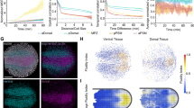 Previous studies suggest that neuroectoderm progenitors show limited cellular rearrangements after regional specification during the early formation of the anterior neural plate (ANP)24,29. However, ANP tissue shape is not preserved during gastrulation32, which raises the intriguing question of how cell and tissue dynamics are coupled to shape the ANP. To address this problem, we studied ANP tissue dynamics throughout gastrulation by using Tg(otx2:Venus) transgenic zebrafish embryos33 that allow visualisation of tissue-specific neuroectoderm progenitor cell fate specification in the prospective ANP (Fig. 1a, b). We observed otx2:Venus expression from ~7.5 h post fertilisation (hpf) onward, with neuroectoderm progenitor cells initially displaying a scattered distribution and irregular tissue outlines (Supplementary Movie 1, Fig. 1b). Analysis of the overall tissue dynamics revealed that little tissue shape changes occurred prior to 8.5 hpf (Fig. 1c–e). However, during later gastrulation stages (8.5–10 hpf) tissue surface area and mediolateral (ML) width decreased rapidly (Fig. 1c, d) while tissue volume was largely preserved (Supplementary Fig. 1a). Notably, ML tissue width was reduced sequentially from anterior to posterior (Fig. 1b; Supplementary Fig. 1b) reminiscent of rotational movements leading to bending of the anterior-lateral tissue edges towards the dorsal midline. This tissue rearrangement culminated in an arrowhead-shaped tissue profile and formation of sharp neuroectoderm tissue boundaries at the end of gastrulation (10 hpf) (Fig. 1b). To corroborate whether ANP shape is indeed controlled by repositioning of neuroectoderm cells rather than modulation of gene expression and cell fate on/off states, we measured otx2:Venus expression levels over time in rearranging cells. We found that otx2:Venus signal increased in neuroectoderm fated cells over time compared to non-neuroectoderm cells outside of the ANP (Supplementary Fig. 1c), suggesting that the final shape of the ANP is defined through physical cell and tissue reorganisation rather than modulation of gene expression. Collectively, these observations indicate that the early ANP is dramatically reshaped during late gastrula.
