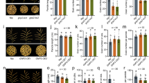 To assess the function of GNP3, we attempted to generate mutants in this gene via clustered regularly interspaced short palindromic repeat (CRISPR)/CRISPR-associated protein 9 (Cas9)-mediated gene editing in the Nipponbare (Nip) background. We obtained four kinds of gene-edited plants: CR1 harbors a 46-bp deletion, CR2 a 41-bp deletion, CR3 a 1-bp insertion, and CR4 a 48-bp deletion in the first exon of the gene (Supplementary Fig. 4a). We failed to obtain homozygous CR1, CR2, or CR3 mutant plants in the T0 or T1 generation; we did isolate homozygous CR4 plants, which retained the complete kinase domain but lacked 16 amino acids near the N terminus. We noticed some dead seedlings in CR1, CR2 and CR3 lines while growing the T2 generation in the paddy field; genotyping and sequencing analysis revealed that these dead seedlings harbored homozygous frameshift mutations (Supplementary Fig. 4b). We concluded that GNP3 is essential for plant survival, in agreement with previous results26, and chose heterozygous GNP3-CR1, GNP3-CR2 and GNP3-CR3 plants for phenotypic characterization. Compared to wild-type (WT) Nip plants, GNP3-CR1, GNP3-CR2, and GNP3-CR3 displayed significantly shorter panicles, fewer secondary branches, and lower GNP, while the number of primary branches was not different from that of WT (Fig. 1c–g). We also noticed the development of a spotted leaf phenotype on the leaves of heterozygous GNP3-CR1, GNP3-CR2, and GNP3-CR3 plants, which began at the late tillering stage (~90 days after planting), gradually spreading from lower leaves to upper leaves (Supplementary Fig. 4c–e). This phenomenon was accompanied by consistently lower chlorophyll content measurements (SPAD values) compared to WT controls (Supplementary Fig. 4f).