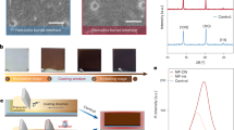 As-coated perovskites are typically annealed to form crystalline films. To probe the practicality of the MPW, we explored the direct writing of perovskite films without annealing step. We replaced high-boiling NMP in the pristine solvent mixture (NMP and 2-ME) with high vapor pressure solvent, tetrahydrofuran (THF), to facilitate rapid solvent drying and crystallization at room temperature, only with gas quenching alone. Figure 3a compares optical microscopy images of the crystallization process of different precursor inks during natural drying. A few small nuclei appeared at ~22 s after using the pristine precursor ink (2-ME + NMP), whereas many large nuclei formed earlier (at ~15 s) and grew rapidly into a uniform and dense film with the volatile precursor ink (2-ME + THF). We then applied in situ UV-Vis absorption spectroscopy to study the phase transition process for both conditions (Fig. 3b, c). As-written perovskite films showed no absorption features in the 550–800 nm range. When gas quenching was introduced at ~13 s, the written precursor films underwent phase transition as evidenced by the appearance of perovskite absorption features. However, due to the strong coordinating of NMP into perovskite in the pristine precursor ink44, this film did not convert into a perovskite phase until thermal annealing was applied. In contrast, gas quenching rapidly crystallized perovskite at room temperature from volatile perovskite ink (2-ME + THF). This result was further verified by X-ray diffraction (XRD) and Fourier transform infrared (FTIR) spectra in Fig. 3d. The diffraction peak of PbI2-NMP complex (2θ = 9.0°) and FTIR peak of C=O vibration (≈1655 cm−1) disappeared after replacing NMP with THF45, indicating that the pure-phase perovskite film can be obtained under annealing-free conditions when using 2-ME and THF solvents (Fig. 3e).