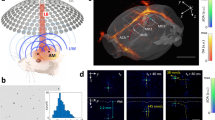 Although the mouse skull can cause refraction and phase distortion, we mitigate these effects in 3D-PAULM by using a hemispherical transducer array that operates at a relatively low frequency of 4 MHz. The acoustic heterogeneity issues, which are usually more prominent for high-frequency ultrasound imaging at >10 MHz52,53, are not of significant concern in our work. The hemispherical detection geometry also partially accommodates varying angles of acoustic wave incidence. We also keep a thin water bath above the scalp to reduce acoustic impedance mismatches at the skin surface.