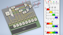 Quadrature multiplexing opens a path towards further bandwidth scaling by spectral stitching of tributary signals in the optical domain, exploiting the fact that the bandwidth of advanced photodetectors9,35,37 is much higher than that of the latest electronic DACs. The long-term vision of such an ultra-broadband PE-AWG is illustrated in Fig. 1d. The scheme exploits a chip-scale optical frequency-comb generator (FCG)49, providing a multitude of phase-locked tones that are individually modulated by an array of N = 4 IQ modulators, each driven by an associated pair of electronic DACs. The resulting spectral tributary signals are then spectrally stitched to form a well-defined time-domain broadband optical waveform \({\underline{A}}_{s}(t)\), which is then down-converted to the electrical domain by an ultra-broadband BPD using the remaining comb tone at frequency f0 as an LO. Importantly, the spectral stitching also relies on precisely controlled optical phases among the various spectral tributaries, which can be accomplished by using essentially the same PSCCs that were described for phase-stabilized coherent down-conversion in Subsection “Active optical-phase stabilization”. For signal stitching, the phase stabilization exploits the interference generated by spectrally overlapping portions of the neighboring signal slices and generates the stitched signal at the OH output labeled with ‘I+’ in Fig. 1a, while the ‘I−’ output remains unused, see30 for details. In the exemplary scheme depicted in Fig. 1d, a tree structure of (N − 1) = 3 PSCCs is used for spectrally stitching the N = 4 tributaries thus forming a well-defined broadband optical waveform. This concept is illustrated by sketching the spectra of tributary and combined signals at several positions A, B, and C in the setup, see Insets Ⓐ to Ⓒ. After the stitching, the entire broadband optical waveform is down-converted to the electrical domain by mixing with a single optical LO tone in an ultra-broadband balanced photodetector (BPD1) connected to the ‘I+’ and ‘I−’ outputs of the last PSCC.