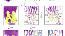 The pentameric assembly is radially organized around loop 8, a folded-over edge of the barrel, making a chamber at the centre of the oligomer (Fig. 2c–e). The net effect of oligomerisation creates a ~100 Å wide bowl-like architecture (rather than five grouped cylinders), whose outer rim is formed from a continuous “wall” of strands 5–14 (Fig. 1c); this is also distinct from classical porins5. The extracellular face of the pentamer is strongly negatively charged (Fig. 1c) with a notable ring of lysines beneath (Fig. 1e). In comparison to classical 16-stranded trimeric porins, the closest relative to PopA is an anion transporter from Comamonas acidovorans (PDB 1E5414, Foldseek15 score 4.8 e-5, sequence identity 13%); superposition reveals that the PopA fold has an altered register such that β-strand order differs by 2 e.g., PopA strand 12 sits over trimeric porin strand 14. This has the outcome of roughly aligning two chains of the PopA pentamer with classical porins, with the central chamber replacing the third.