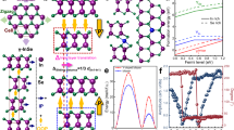 ReSe2 is a high ambient stable van der Waals material where each layer is composed of a Re atoms plane sandwiched between two Se atoms planes27. Different from the most common group-VI transition metal dichalcogenides (e.g., MoS2 and WS2), there are unbound valence electrons outside the nucleus of the Re atom in ReSe2. Due to the Jahn-Teller effect (or Peierls distortion), the adjacent Re atoms are bonded in the form of zigzag Re4 clusters and align along b-axis direction to form Re4 chains, forming a distorted octahedral (1T′) structure and reducing the symmetry of structures (Fig. 1a)28,29,30. In addition, the Peierls distortion greatly weakens the van der Walls interaction in the interlayer31. The low-symmetry structure and weak van der Waals interlayer interactions of ReSe2 endow it the unique ability of interlayer sliding32, which facilitates the realization of low-potential-barrier interlayer sliding. ReSe2 crystal was synthesized using the chemical vapor transport method, and ReSe2 flakes of different thicknesses were mechanically exfoliated using polydimethylsiloxane (PDMS) films to further verify their atomic structure and physical properties (More details can be found in “Methods”). Figure 1b, c shows atomic-level high-angle annular dark-field (HAADF) image and selected area electron diffraction (SAED) pattern of ReSe2 flake along the [120] zone axis. The results exhibit high-quality layered parallel stacking structure. The ultraviolet-visible-near infrared (UV-Vis-NIR) absorption spectra of samples with different thicknesses show the sharp absorption edge near 950 nm (Fig. 1d). From the Tauc plot, the band gap was calculated to be ~1.1–1.2 eV, which is very close to the reported value27,33. The transfer characteristic curve indicates that ReSe2 is an ambipolar semiconductor material (Supplementary Fig. 1). From Raman results of ReSe2 with different thicknesses (Fig. 1e and Supplementary Fig. 2), the peaks at 124 cm−1 and 173 cm−1 correspond to the in-plane Eg-like mode and the out-of-plane Ag-like mode, respectively, and the around 13 modes were observed between 100 cm−1 and 300 cm−1, which is much more than that of other transition metal dichalcogenides34. These Raman peaks are mainly attributed to the low crystal symmetry of ReSe2 and related to fundamental in-plane and out-of-plane Raman modes27. The anisotropy of ReSe2 flake, caused by its low crystal symmetry, was confirmed by the excitation angle-resolved Raman spectra (Supplementary Fig. 3a–d). Subsequently, second harmonic generation (SHG) technique, a reliable tool for demonstrating the non-centrosymmetric structure35,36, was adopted to characterize the structural symmetry of ReSe2 flakes. The schematic diagram of the SHG was shown in Supplementary Fig. 4a. Figure 1f illustrates the SHG intensity of samples with different thicknesses. A significant SHG signal at 532 nm was observed under the excitation wavelength of 1064 nm, revealing ReSe2 flakes have a non-centrosymmetric structure. The power-dependent SHG intensity of ReSe2 flake (~2.5 nm) was investigated (Supplementary Fig. 4b), and the SHG intensity increased monotonically with the power intensity. We further investigated the effect of crystal structure on signal intensity by polarization-resolved SHG. A clear four-lobed pattern was observed (Supplementary Fig. 4c), showing the variation of SHG intensity with azimuthal angle. The above results confirm that ReSe2 is a parallel-stacked semiconductor material with a non-centrosymmetric structure.